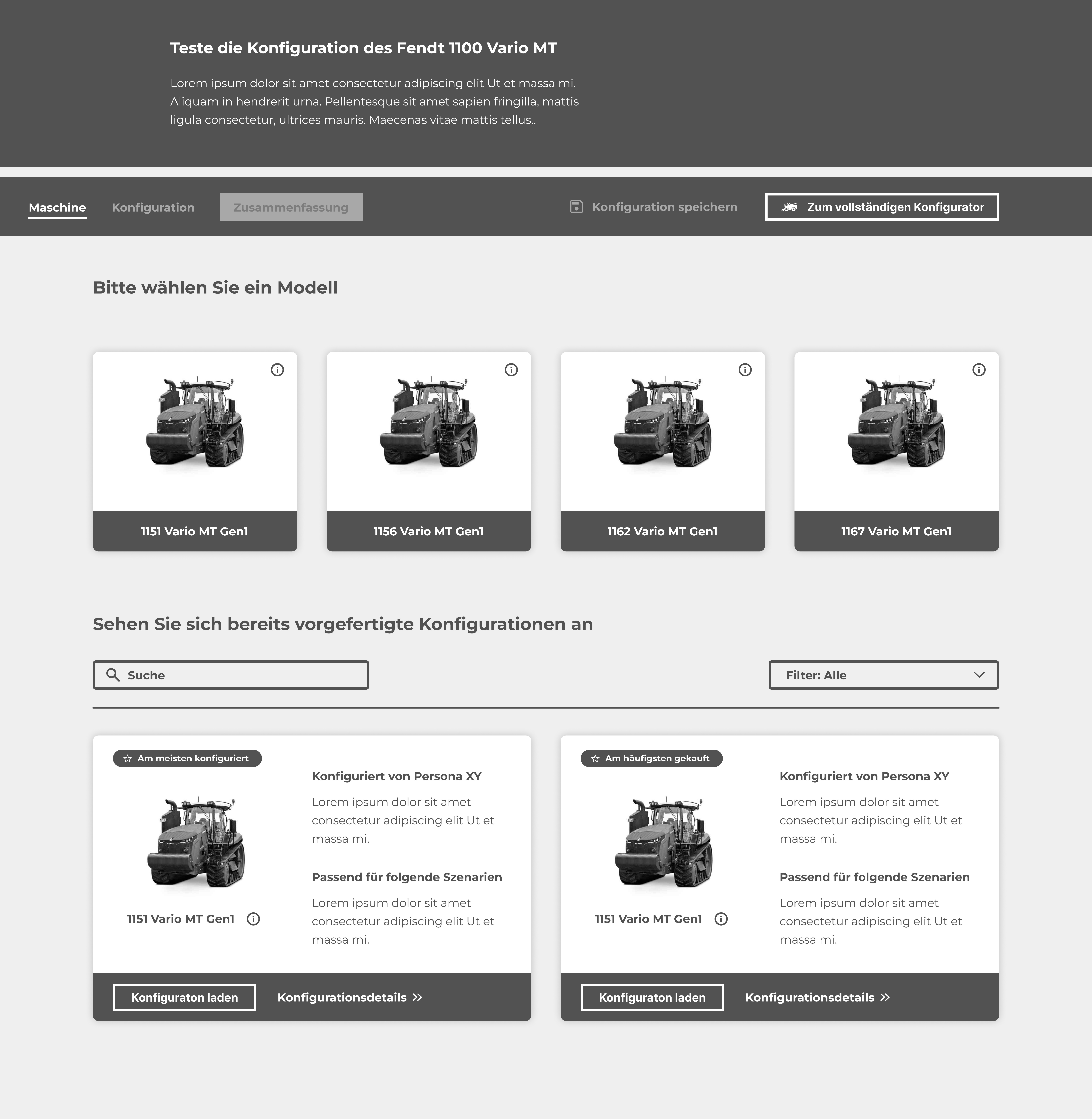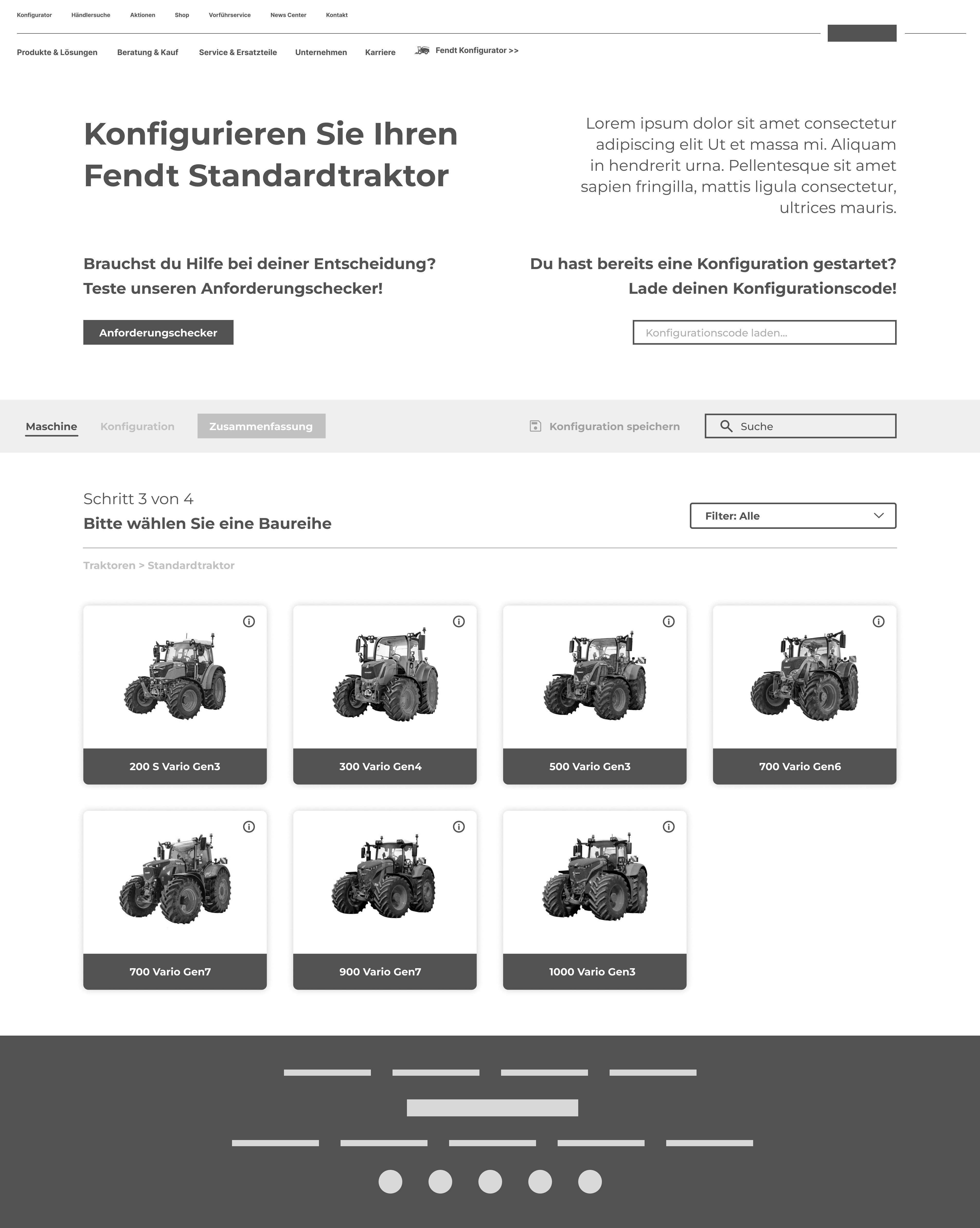 Der bestehende Fahrzeugkonfigurator von Fendt sollte strategisch und nutzerzentriert überarbeitet werden. Ziel war es, das Nutzungserlebnis zu verbessern, Einstiegspunkte klarer zu gestalten und gleichzeitig die Leadgenerierung und Conversion Rate messbar zu steigern.