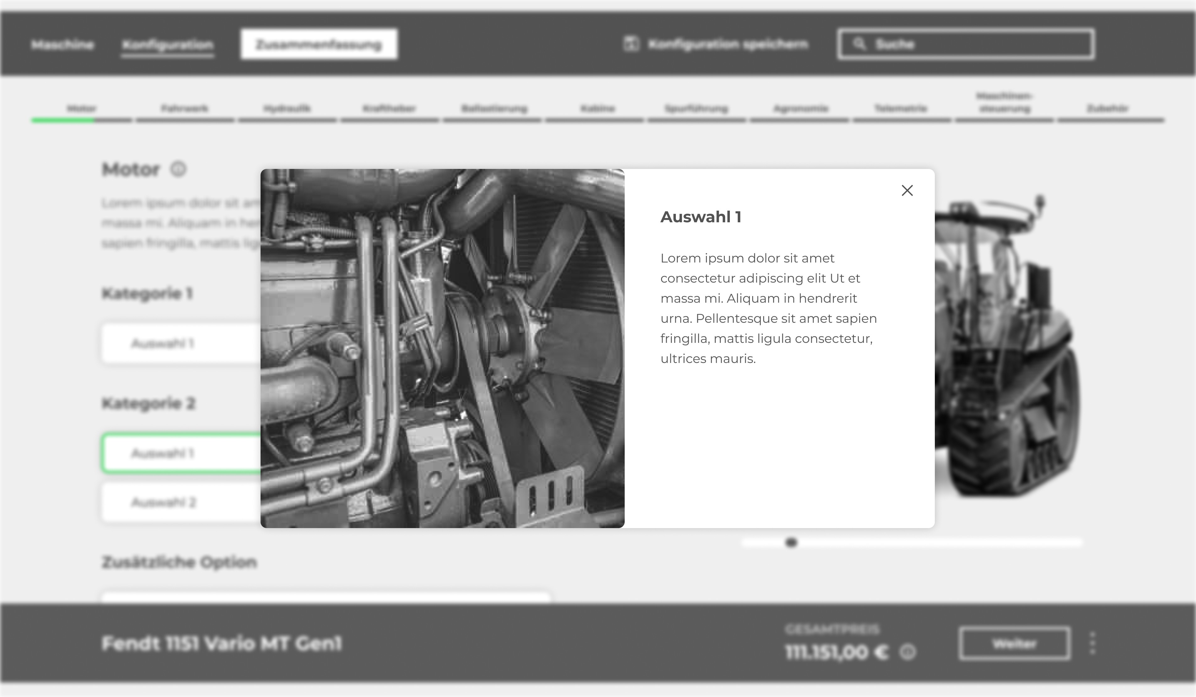 Der bestehende Fahrzeugkonfigurator von Fendt wurde in mehreren Ausbaustufen komplett überarbeitet. Ziel war es, Nutzerführung und Einstieg zu verbessern – vom iFrame-Placement auf der Startseite bis hin zu Overlay-Lösungen und einem optimierten User Flow durch den gesamten Konfigurator. Meine Aufgabe: Konzeption, Struktur und Interaktionsdesign.